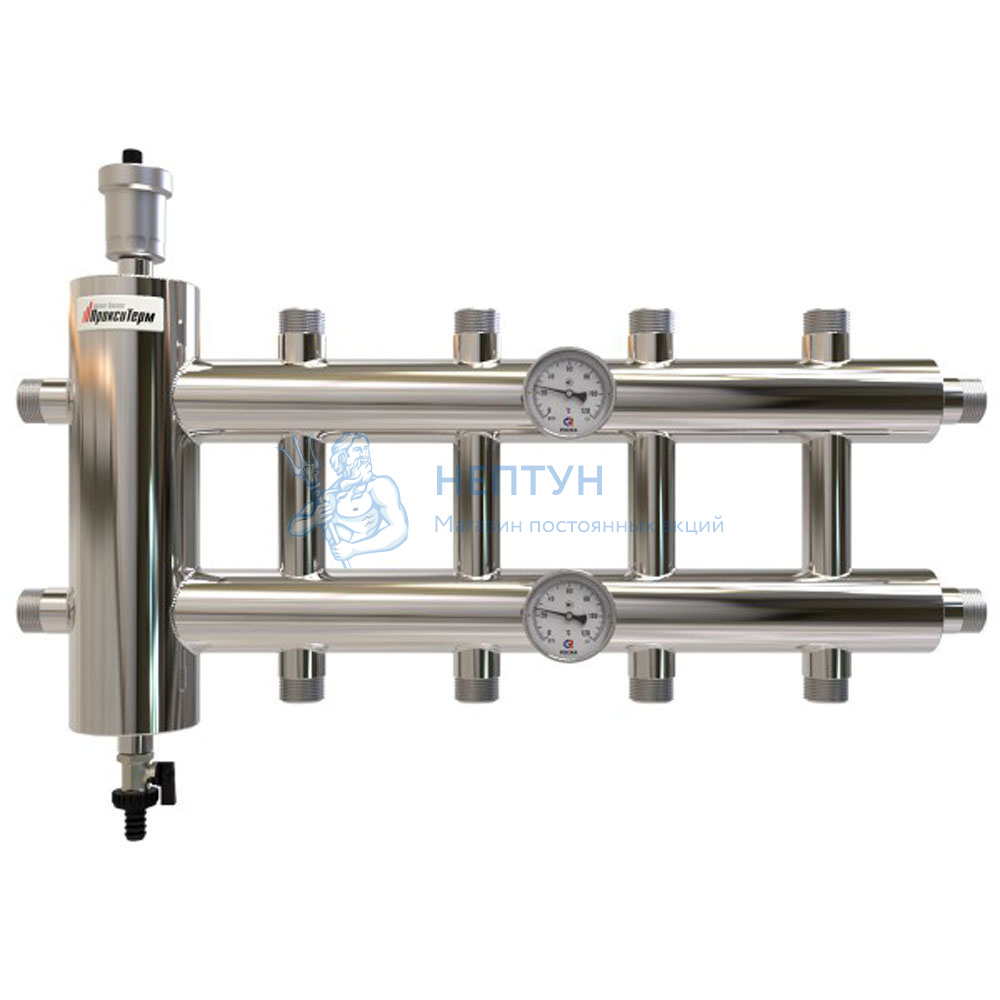 Распределительный коллектор с гидравлическим распределителем необходим для отопительных систем, где присутствует пять потребителей тепла, имеющие различные показатели температуры теплоносителя и расхода. Конструкция состоит из подающего и обратного коллекторов, которые располагаются друг над другом. Коллектор идет в комплекте с гидрострелкой. Благодаря стальному корпусу прибор обладает высокими износостойкими показателями, а также способен выдерживать наивысшее давление среди аналогов на рынке.