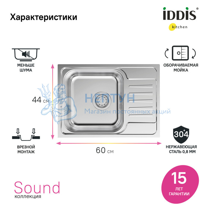 - Мойка нерж. сталь, шелк, с крылом, 605*440*180, Sound, Iddis SND60SDi77