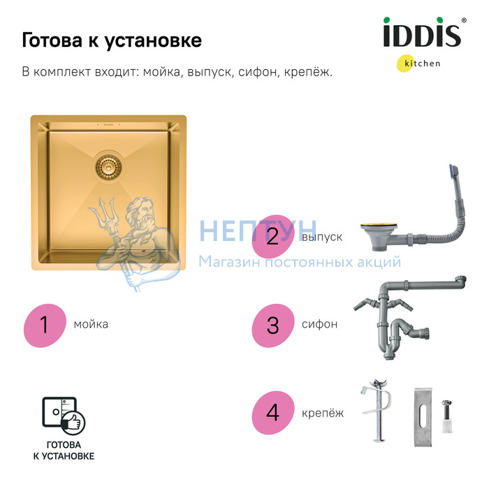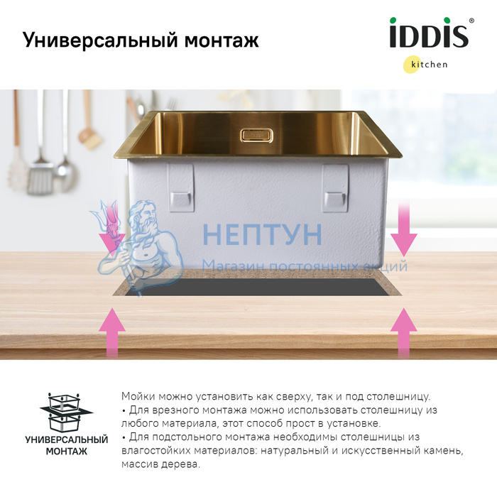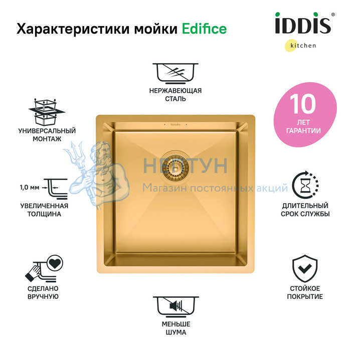 - Мойка нерж.сталь, универсального монтажа, матовое золото, 440*440, Edifice, Iddis EDI44B0i77