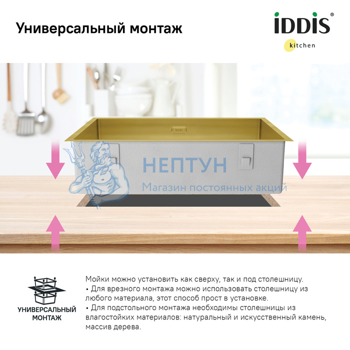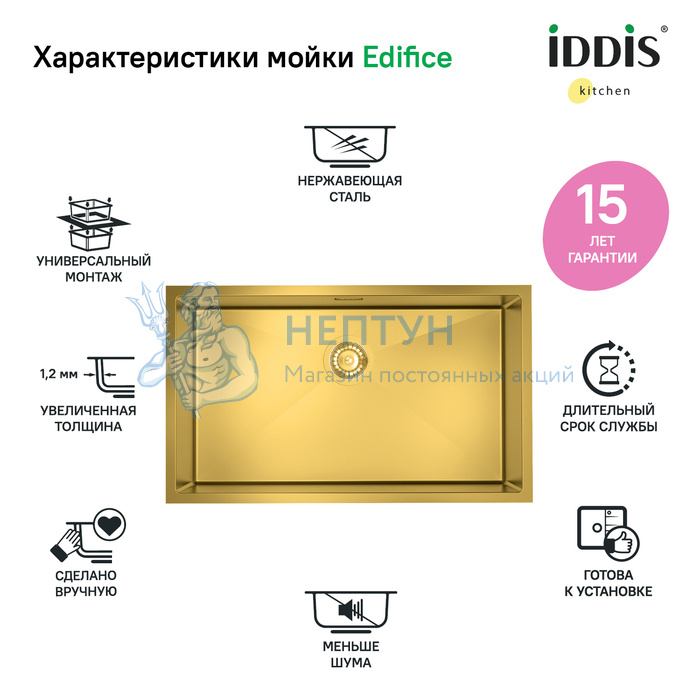 - Мойка нерж. сталь, универсального монтажа, матовое золото, 740*440, Edifice, Iddis EDI74B0i77