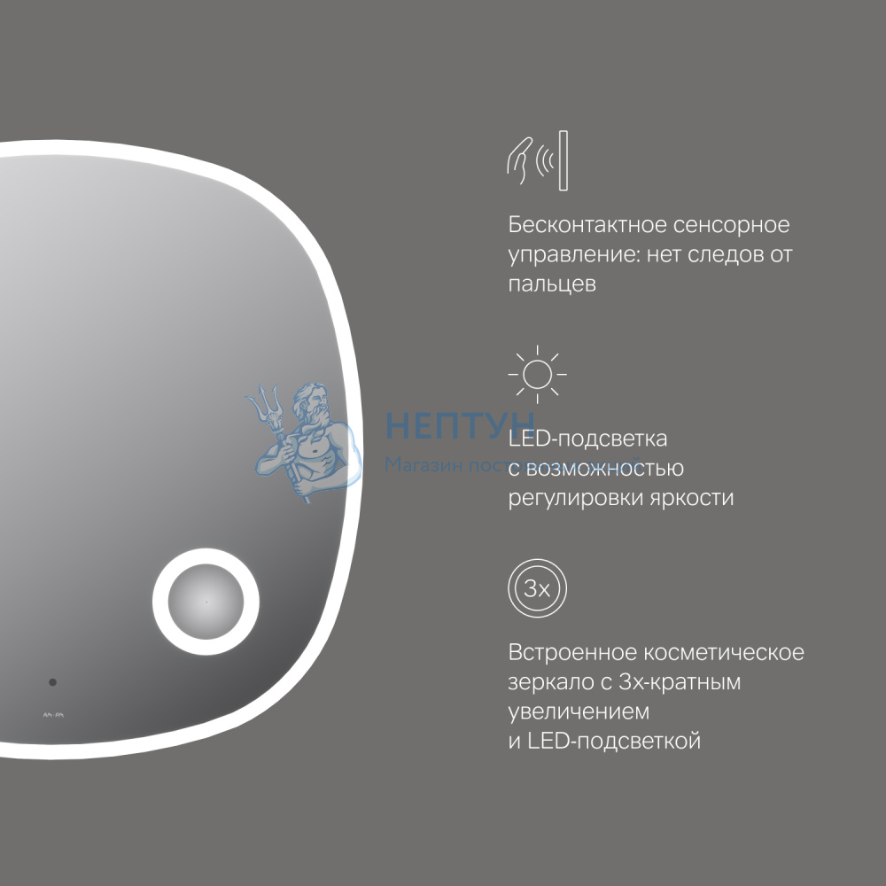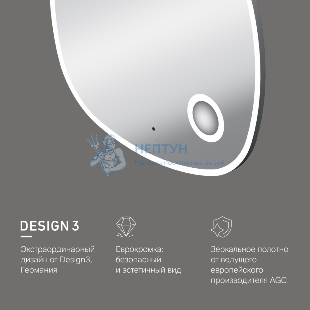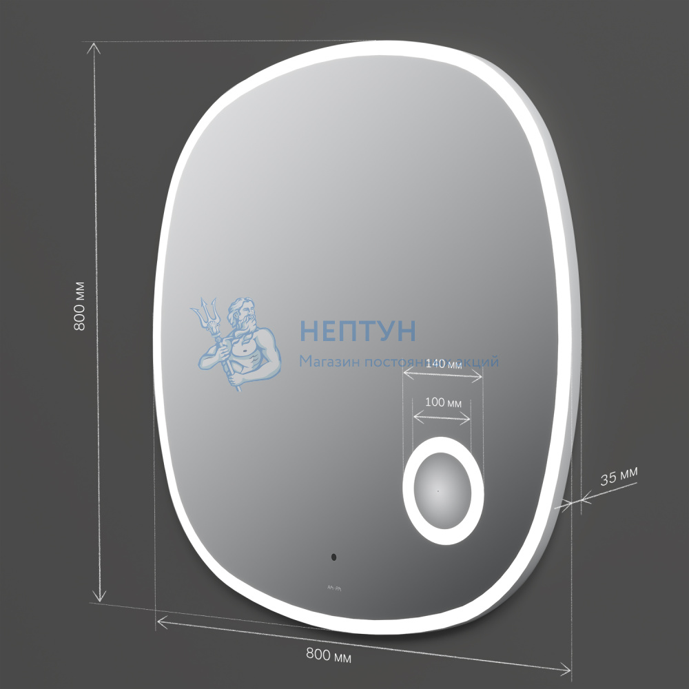 В качестве элемента LED-подсветки используется светодиодная лента которая создает мягкое и равномерное свечение по контуру всего зеркала. Управление подсветкой осуществляется при помощи бесконтактного сенсора нового поколения. Он позволяет управлять включением/выключением и яркостью LED-подсветки без касания зеркального полотна. Зеркало дольше остается чистым.