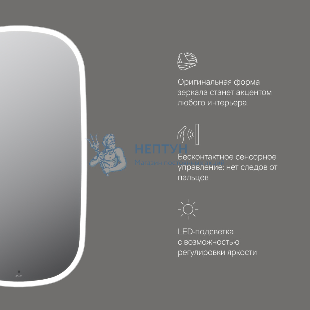 В качестве элемента LED-подсветки используется светодиодная лента которая создает мягкое и равномерное свечение по периметру всего зеркала. Управление подсветкой осуществляется при помощи бесконтактного сенсора. Сенсор нового поколения позволяет управлять включением/выключением и яркостью LED-подсветки без касания зеркального полотна. Зеркало дольше остается чистым. Зеркало поставляется в комплекте с настенным крепежом и инструкцией. ""