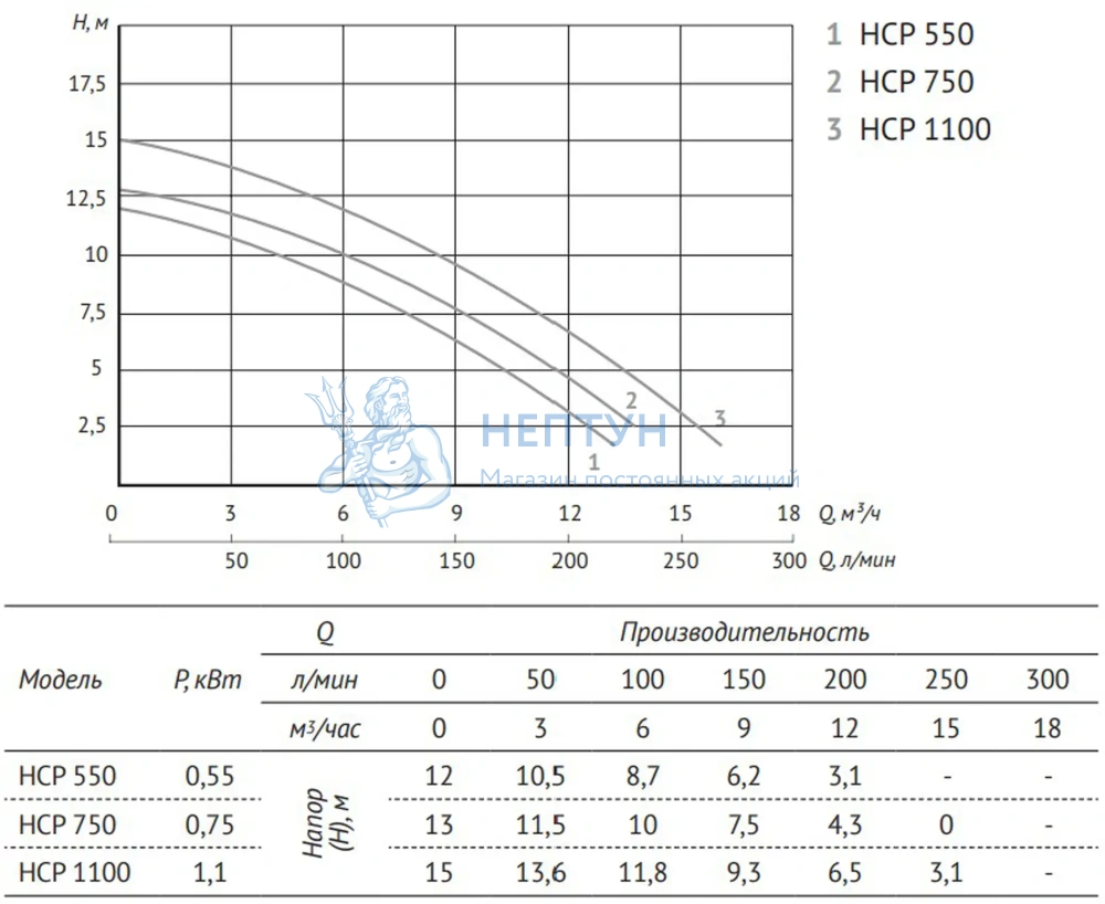 Электродвигатель – асинхронный однофазный со встроенной термозащитой и медной обмоткой статора. Может работать непрерывно до 6 часов. Конструкция проточной части обеспечивает высокую производительность насоса при низком энергопотреблении.