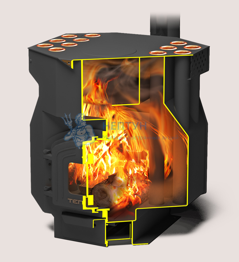 В «ТОП -Драйв» нагрев воздуха помещения происходит в раскаленных трубах печи, которые размещаются непосредственно в топке. Продвигаясь снизу вверх, горячий воздух выходит мощными горячими потоками из конвекционных отверстий и стремительно разносит тепло по комнате.