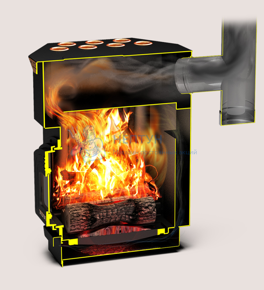 При полной загрузке печи дровами длительность горения составит 8 часов. Герметичная чугунная дверца с запорным механизмом, защитный экран на задней стенке топки с функцией подачи вторичного воздуха и двухоборотная топка «выжмут» из печи максимум!
