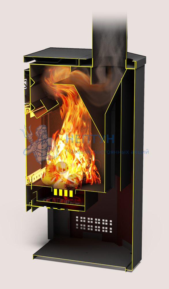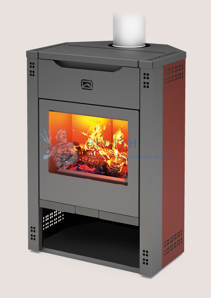 Сложная топка из жаростойкой нержавеющей стали, скрытая за декоративным кожухом-конвектором, даёт очень много тепла. Кожух-конвектор терракотового цвета, кроме того, что представляет собой защитно-декоративную функцию, обеспечивает быстрый прогрев конвекционными потоками.