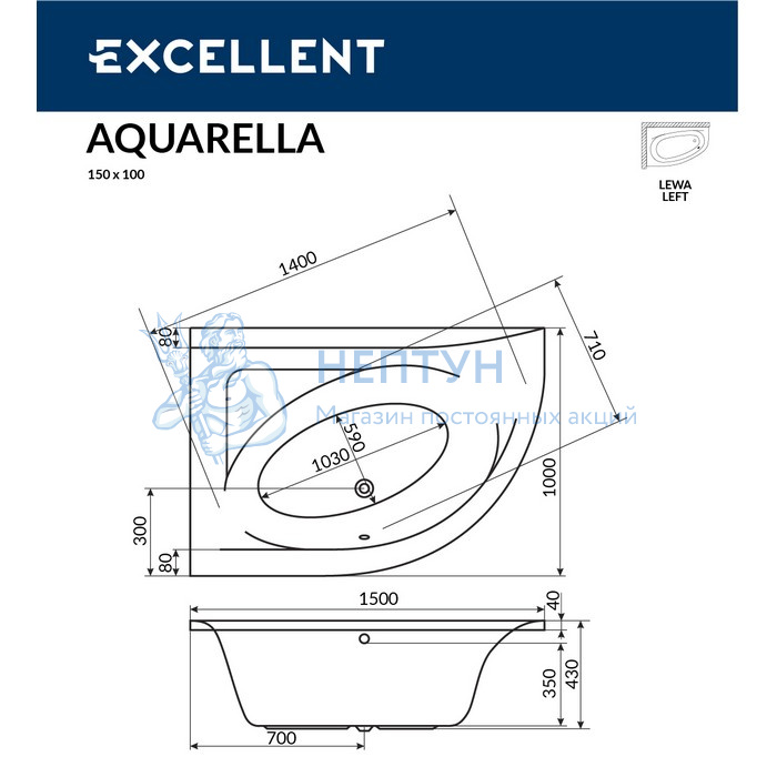 - Ванна Excellent Aquarella 150x100 (левая) "RELAX" (бронза)