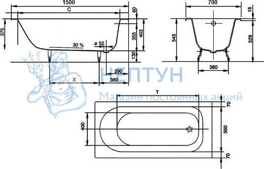 - Чугунная ванна 150х70 Jacob Delafon Soissons E2941-00