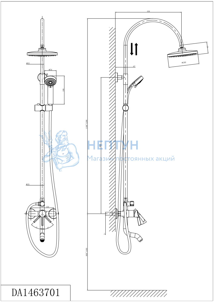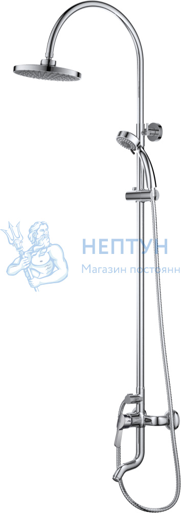 Функциональная душевая система с широкой лейкой, с эффектом настоящего тропического ливня. Штанга регулируется под любой рост.