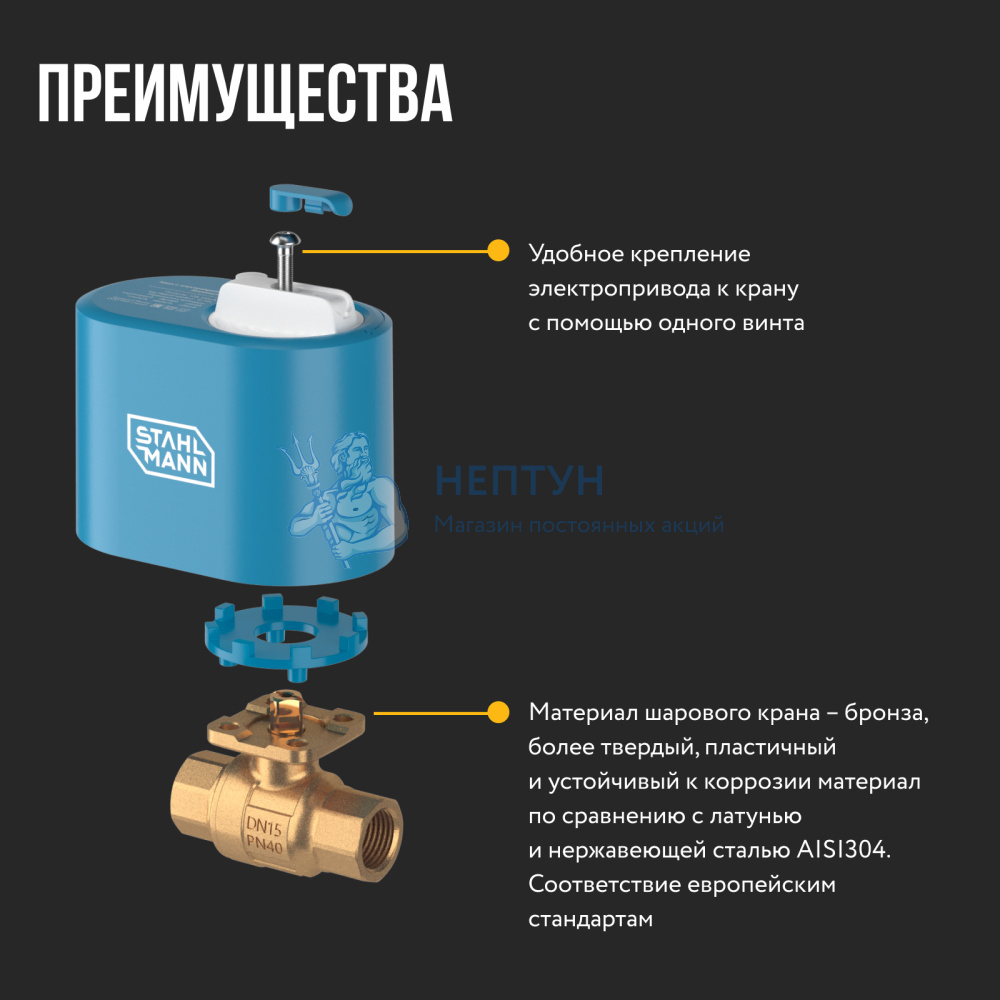 - Кран шаровой с электроприводом Stahlmann 1/2F 12В