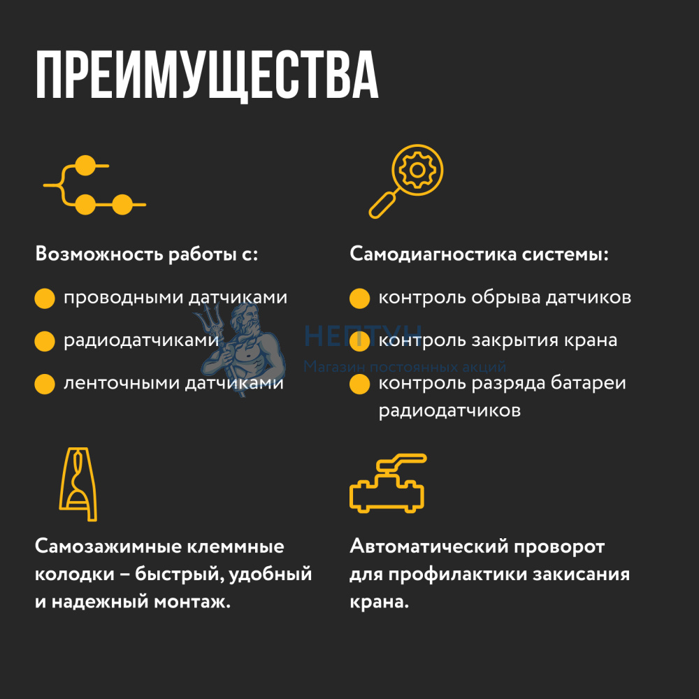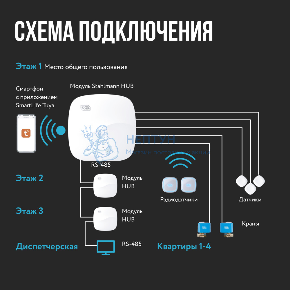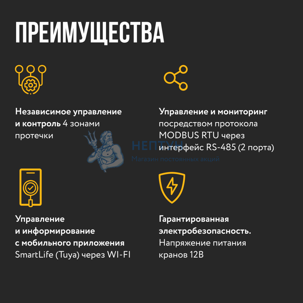 Управление и контроль системы осуществляется через приложение на смартфоне и посредством протокола MODBUS через интерфейс RS-485 . Модуль совместим с проводными, беспроводными и ленточными датчиками контроля протечки воды и оснащен световым и звуковым оповещением при аварии.