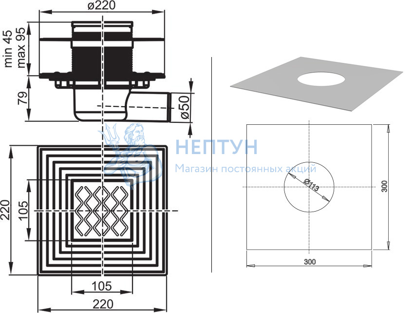 - Душевой трап SN501 105х105/50 - stainless X01435