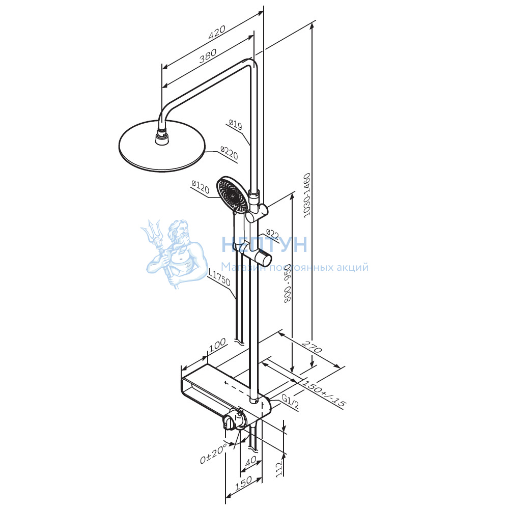 Телескопическая штанга с диапазоном регулировки 400 мм сделает процесс принятия душа удобным для людей любого роста. А благодаря увеличенным размерам тропического (220 мм) и ручного (120 мм) душей вы ощутите все преимущества использования дизайнерского продукта.